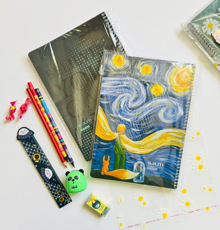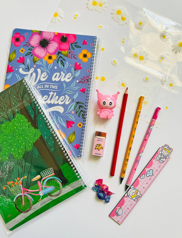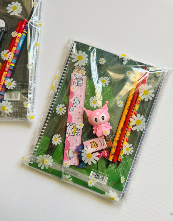 بسته بندی: دو دفتر شصت برگ ،دو عدد مداد ،یک عدد مداد قرمز ،تراش مخزن دار ،پاکن ژله ای ، خط کش