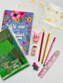 بسته بندی : دو دفتر شصت برگ ،دو عدد مداد ،یک عدد مداد قرمز ،تراش مخزن دار ،پاکن ژله ای ، خط کش